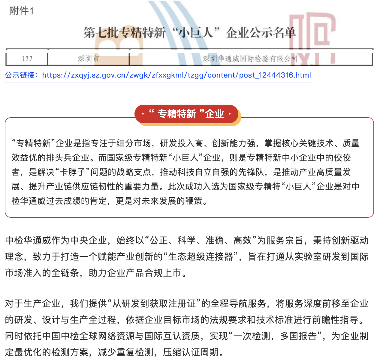 企业荣誉丨中检华通威荣获国家级专精特新“小巨人”企业称号