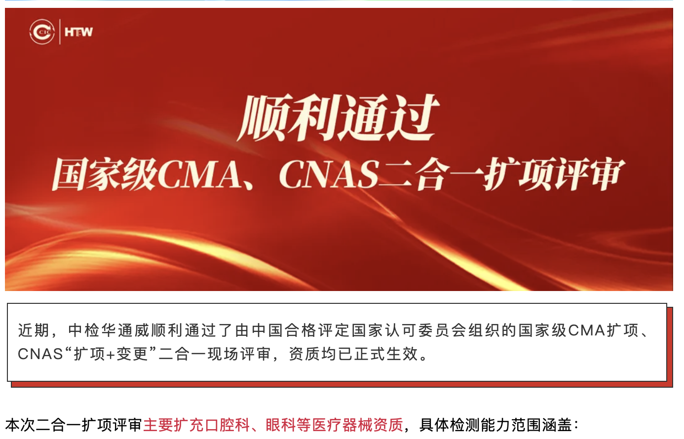 中检华通威顺利通过国家级CMA、CNAS二合一扩项评审